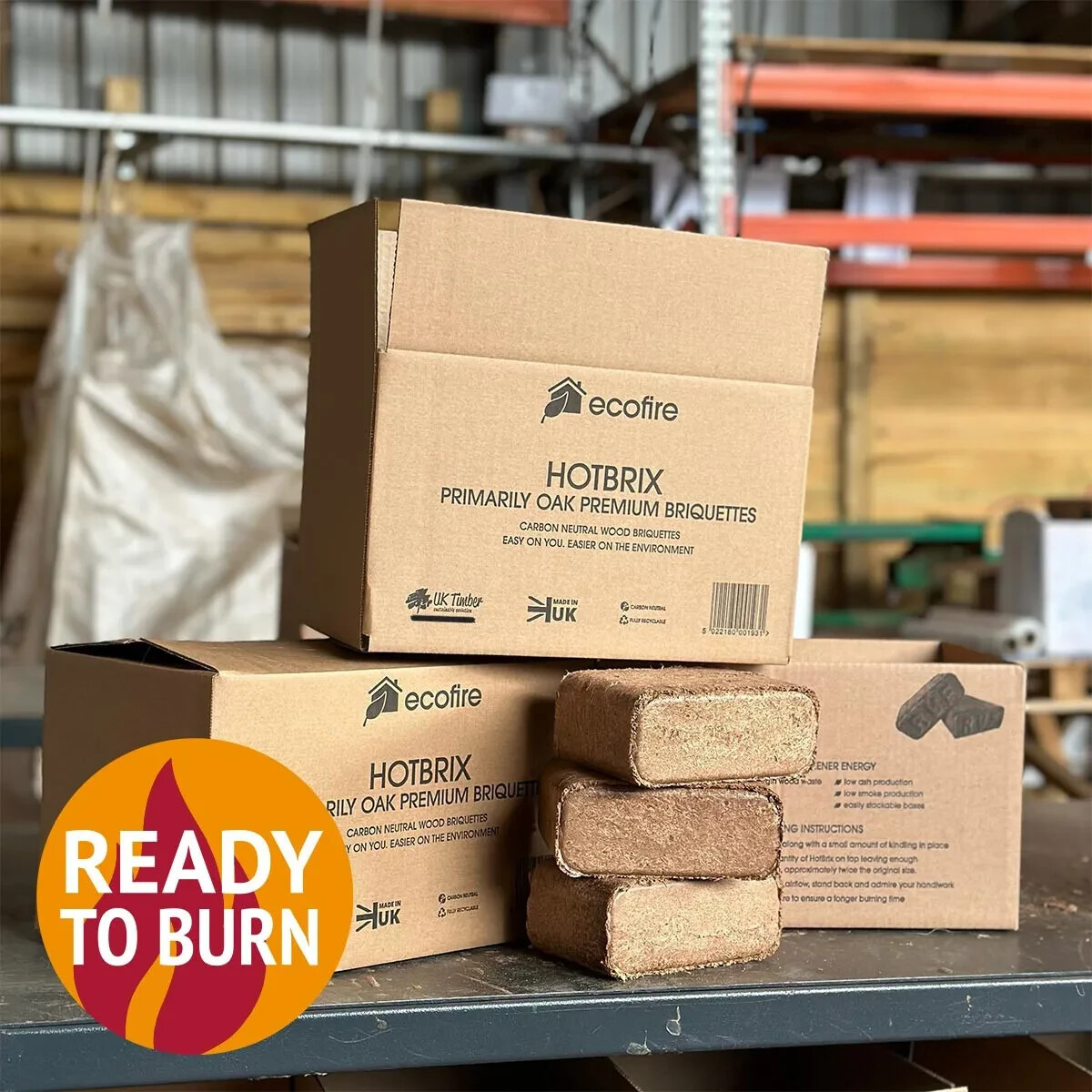 - Made from eco-friendly cardboard, the boxes can simply be burned when empty alongside the briquettes leaving less waste to deal with.